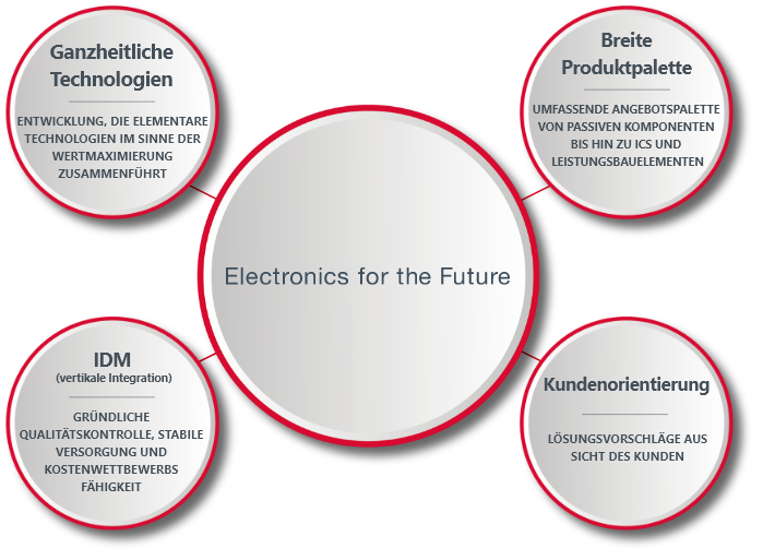 Als Hersteller von Halbleitern und elektronischen Komponenten hat ROHM seit seiner Gründung vor mehr als 60 Jahren sein Geschäftsfeld durch den Aufbau von Design- und Fertigungstechnologien, Qualitätssicherungssystemen und Lösungsvorschlägen erweitert. Diese Technologien und Fähigkeiten, die im Laufe von ROHMs langer Geschichte gesammelt wurden, lassen sich in vier Hauptmerkmale sortieren: ganzheitliche Technologien, IDM (vertikale Integration), breite Produktpalette und Kundenorientierung. Durch die Fokussierung auf die Bereiche Leistungselektronik und Analogtechnologie, in denen diese Eigenschaften als Stärken maximal zum Tragen kommen, bieten wir unseren Kunden einen hohen Mehrwert und tragen zur Lösung gesellschaftlicher Probleme bei.