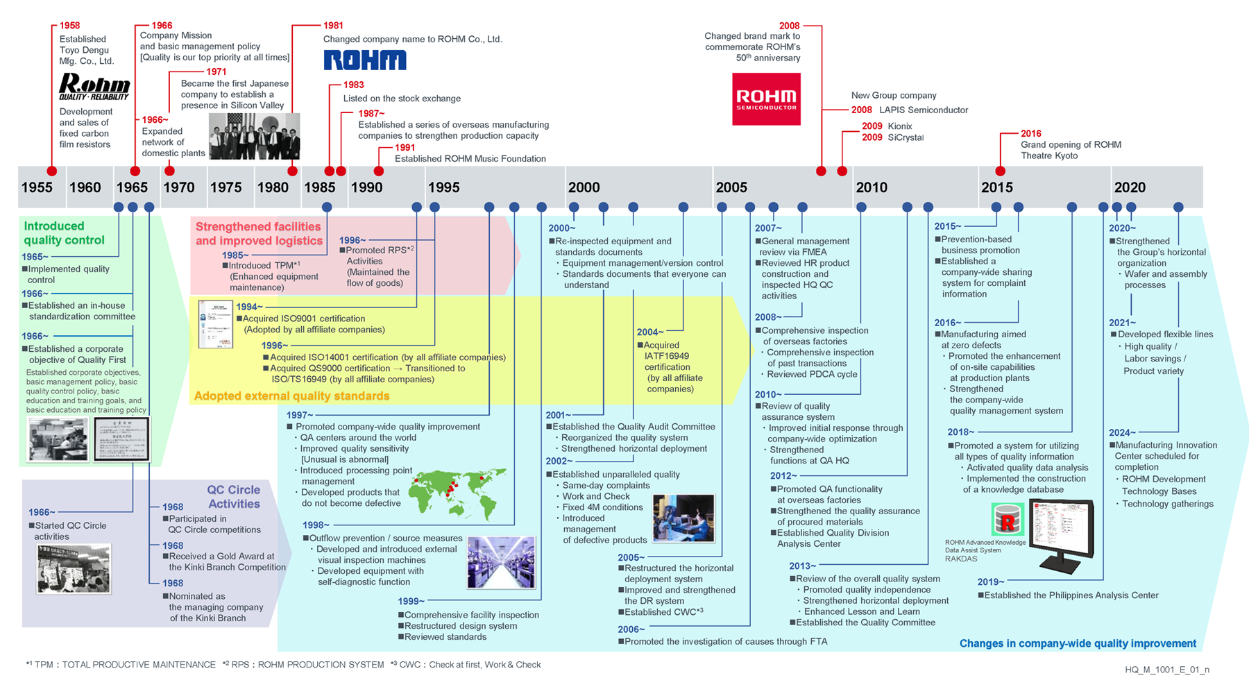 ROHM kann auf eine lange Geschichte der Qualitätskontrolle zurückblicken, die bis ins Jahr 1965 zurückreicht. Im darauf folgenden Jahr haben wir unser Unternehmensziel "Quality is our top priority" festgelegt, und seitdem arbeitet das gesamte Unternehmen an der Verbesserung der Qualität.