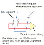 Ein MR-Sensor (Magnetoresistiver Sensor) misst die Feldstärke durch Änderung einzelner elektrischer Widerstände in Abhängigkeit vom Magnetfeld.