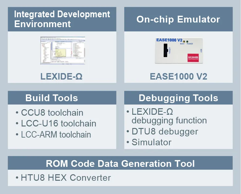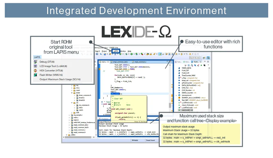 - LAPIS Development Tools LEXIDE-Ω is the application program developing environment for LAPIS Technology 8-bit RISC processors based on the nX-U8/100 core or 16-bit RISC processors based on the nX-U16/100 core, and for ROHM microcontrollers based on the Arm® Cortex®-M core.