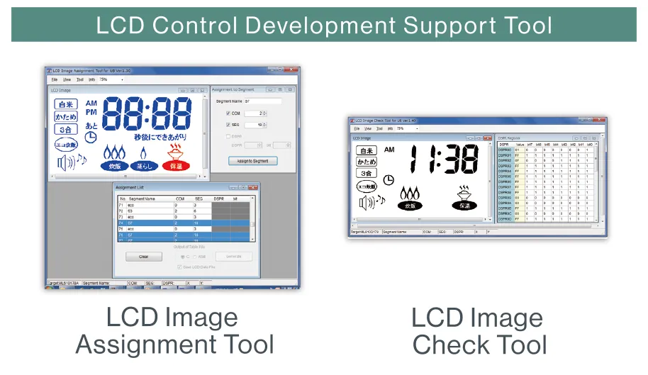 - The LCD image assignment tool supports the mapping work of the microcontroller pin and the LCD panel segment on the LCD panel image displayed on the PC.