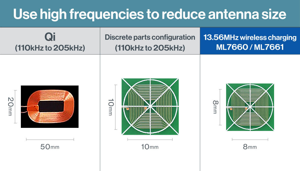 Using the 13.56MHz frequency band,the antenna size can be reduced by 83% compared to Qi(Qi)*(110kHz to 205kHz),a common feeding method used in smartphones.