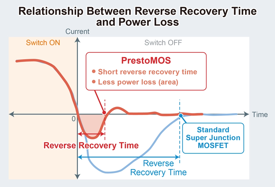 „Presto" ist ein italienischer Begriff aus der Musik und bedeutet „sehr schnell". PrestoMOS ist der originale Leistungs-MOSFET von ROHM, der die hohe Spannungsfestigkeit und den niedrigen Einschaltwiderstand der Super-Junction-MOSFETs beibehält und gleichzeitig die Sperrverzögerungszeit der integrierten Diode verkürzt. Durch die verringerten Schaltverluste eignet er sich hervorragend für ein breiteres Anwendungsspektrum mit Inverter-Schaltungen, z. B. bei Klimaanlagen und Kühlschränken.