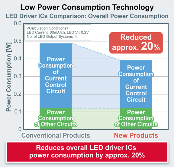 Die neuen ICs nutzen eine unternehmensspezifische Technologie mit geringer Stromaufnahme, um die Verluste in den Stromsteuerungsschaltungen der LED-Treiber zu reduzieren. Das Ergebnis ist ein um 20 % geringerer IC-Gesamtstromverbrauch im Vergleich zu herkömmlichen Produkten unter typischen Bedingungen (80 mA/Kanal LED-Schaltkreisstrom, 12-V-Stromversorgung). Dies trägt zu einer geringeren Stromaufnahme bei mittleren bis großen Fahrzeugdisplays bei, bei denen der Stromverbrauch ein Thema ist.