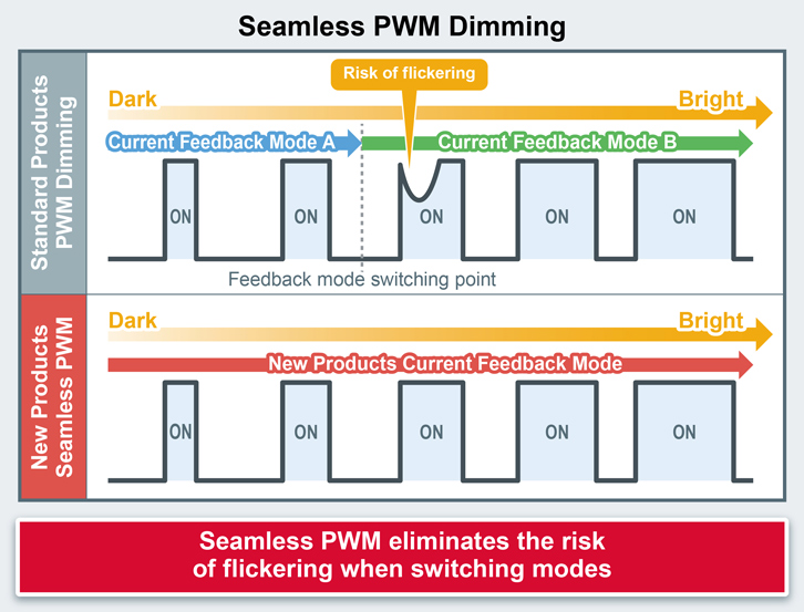 Gleichzeitig sind alle Modelle sowohl mit DC- als auch mit PWM-Dimming ausgestattet, um eine Vielzahl von Anforderungen zu erfüllen. Da bei der ursprünglichen nahtlosen PWM-Dimmtechnologie von ROHM der Stromrückkopplungsmodus für den Wechsel zwischen niedriger und hoher Helligkeit nicht mehr umgeschaltet werden muss, wird das Flackern, das beim allgemeinen PWM-Dimmen auftritt, reduziert und damit die Systemzuverlässigkeit erhöht.
