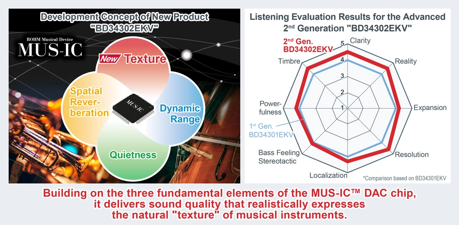 ROHMs neuestes Produkt baut auf dem MUS-IC™ BD34301EKV Audio-DAC-Chip der ersten Generation auf. Dieser ist für seine Klangqualität bekannt und wird in vielen High-End-Modellen verschiedener Unternehmen eingesetzt. Der BD34302EKV übernimmt das Kernkonzept des DAC-Chips von ROHM – den natürlichen, flachen Klang – und fügt die drei Elemente des räumlichen Nachhalls, der Geräuschlosigkeit und des Dynamikbereichs der MUS-IC™-Serie hinzu, um die „Textur“ von Musikinstrumenten authentisch zu reproduzieren und ein noch realistischeres Klangerlebnis zu schaffen.