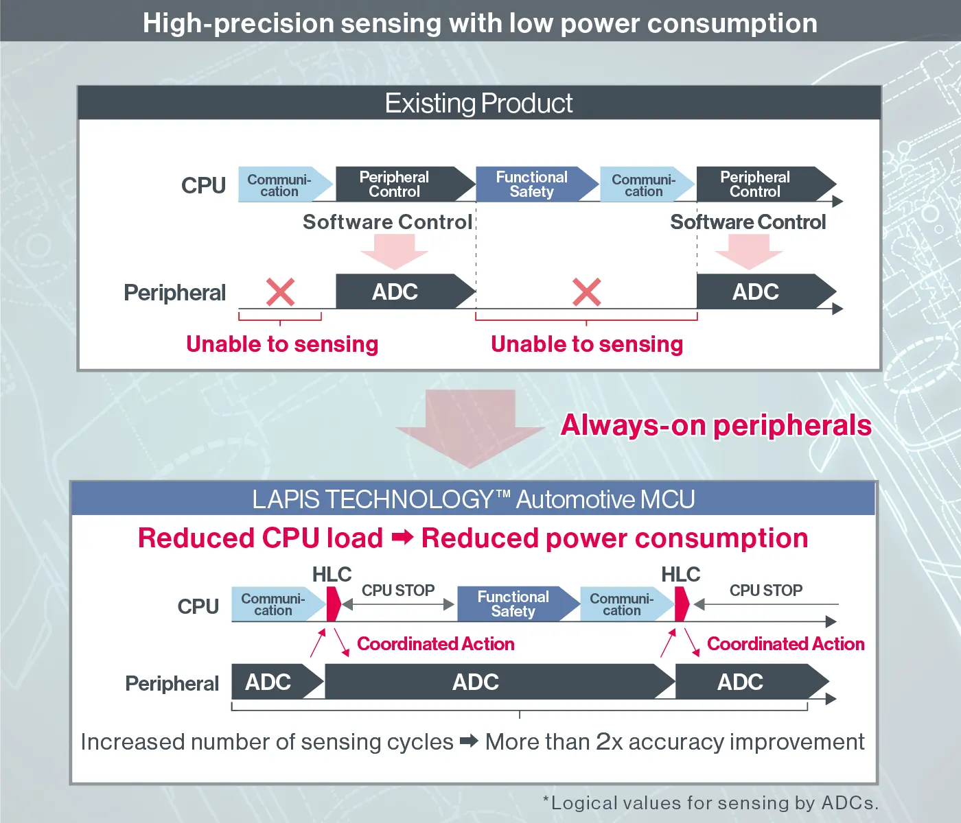 HLC (Hardware Linkage Controller) unique to LAPIS TECHNOLOGY™ can perform linkage operations between peripherals such as A/D converters and PWM without software processing by the CPU.