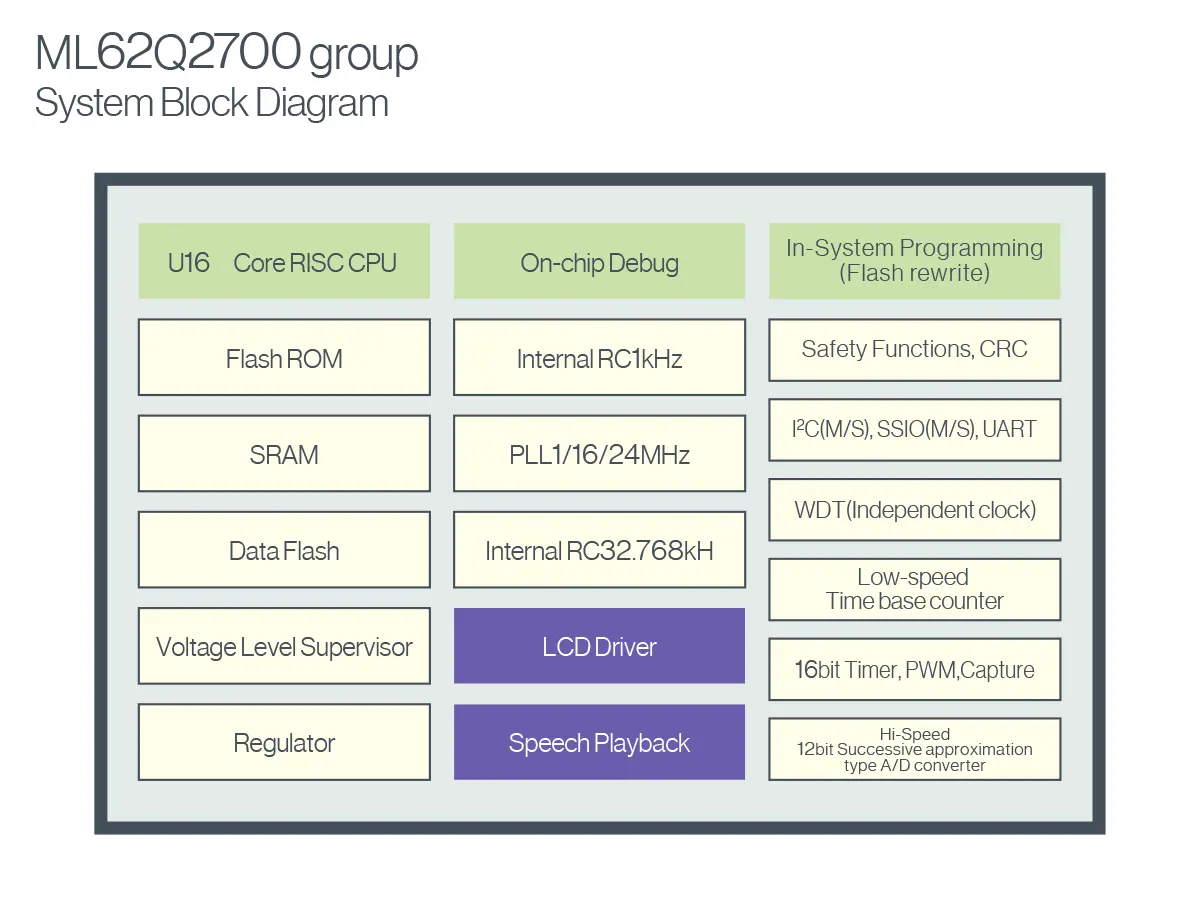 The ML62Q2700 group which is equipped with the original RISC 16bit CPU "U16 Core" is a General-Purpose 16bit MCU. The ML62Q2700 group is equipped with a speech playback hardware engine that enables easy speech playback, a maximum 480-dot LCD driver, and a high-speed 12-bit successive approximation A/D converter that contributes to improved sensor measurement accuracy.
