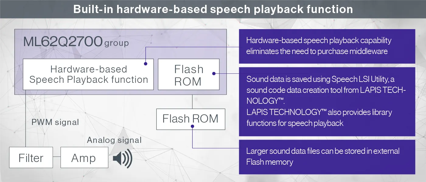 Built-in hardware-based ADPCM speech playback function that can reduce the CPU load when playing guidance and sound effects.