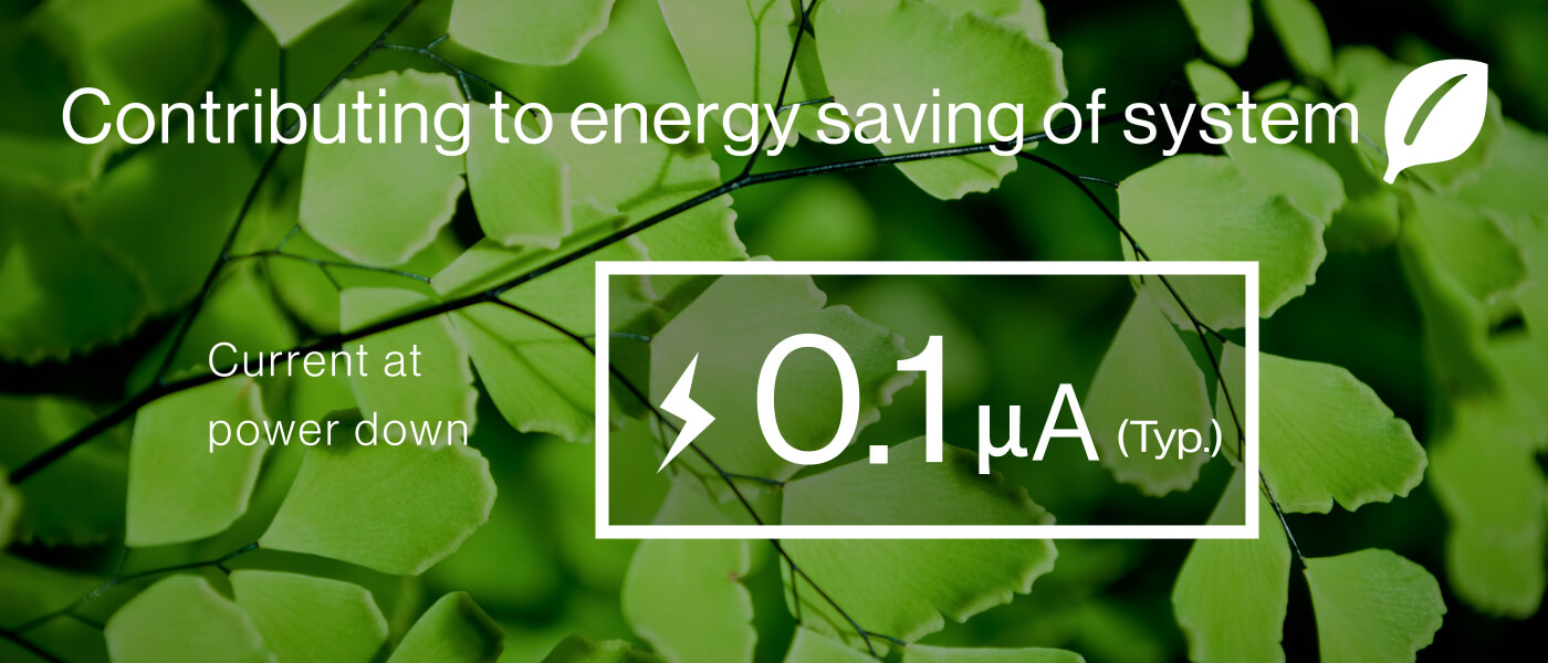 The current consumption in power-down mode is 0.1µA (typ.) which is the lowest in the industry, and battery pack long-term storage is possible.