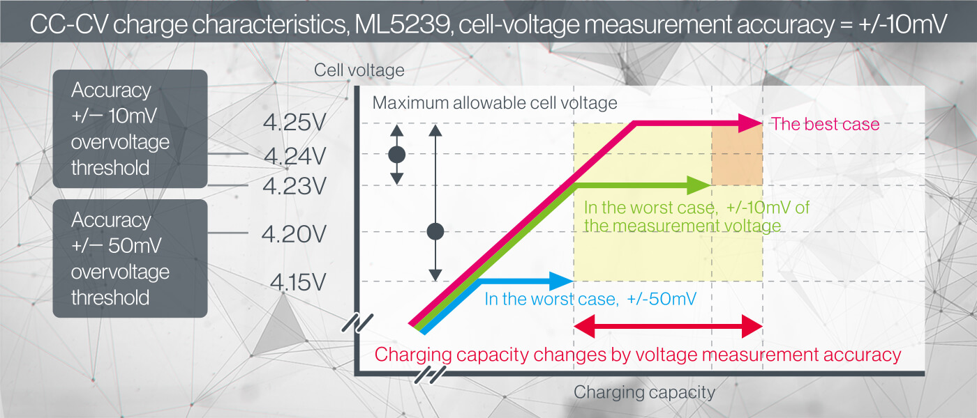The cell voltage measurement accuracy is the industry's best ±10 mV (ML5239). Since each cell voltage of the battery pack can be measured with high accuracy, the battery capacity can be used to the full.