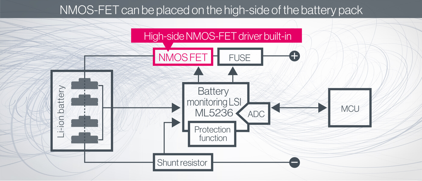 In the ML5248 and the ML5236, because NMOS-FETs can be placed on the high-side of the battery pack, the battery pack system design is very simple.