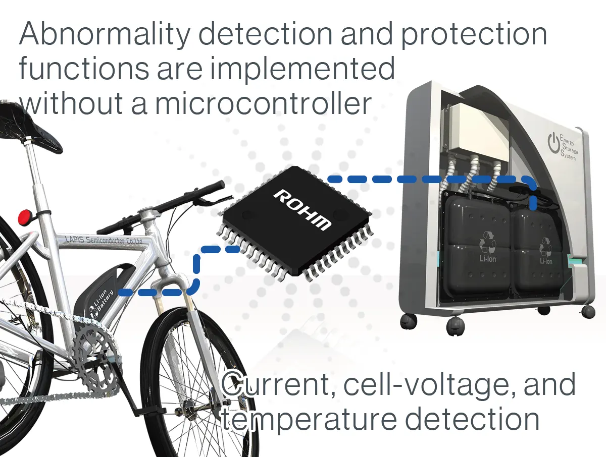 The MCU Control type battery monitoring LSI measures voltage, current, and temperature with high accuracy. And it protects the battery pack with being controlled by an external microcontroller.