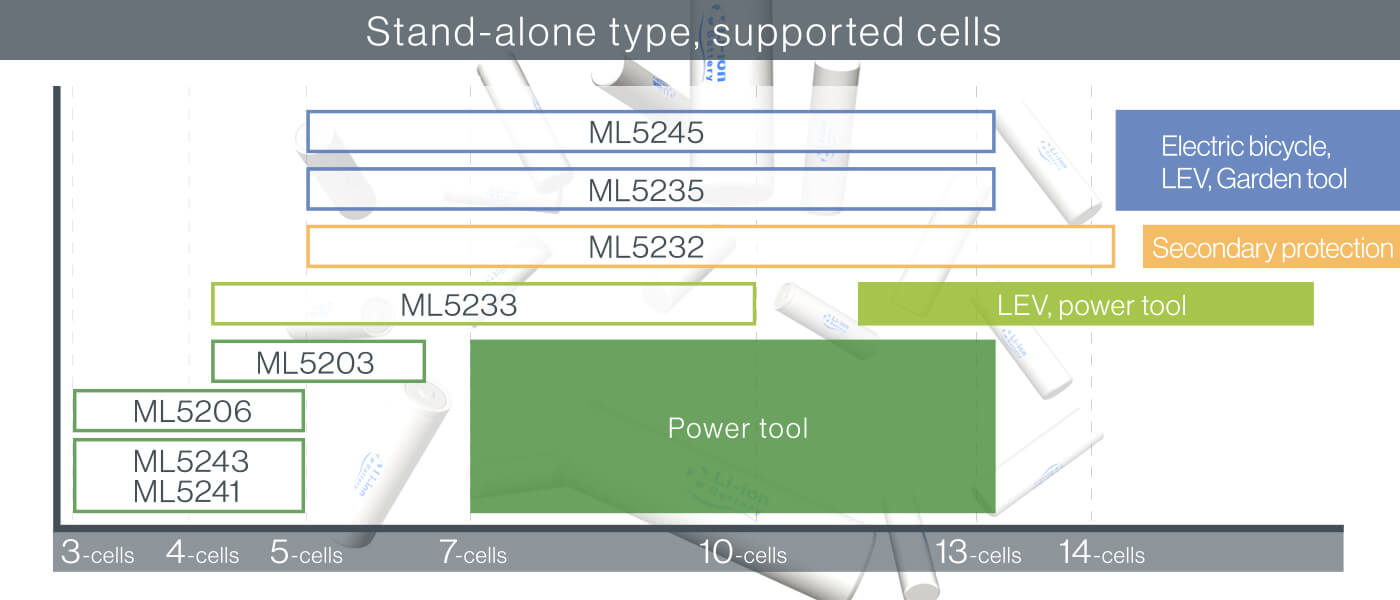 ML5232 supports up to 14-cells as a secondary protection LSI for multi-cell systems.