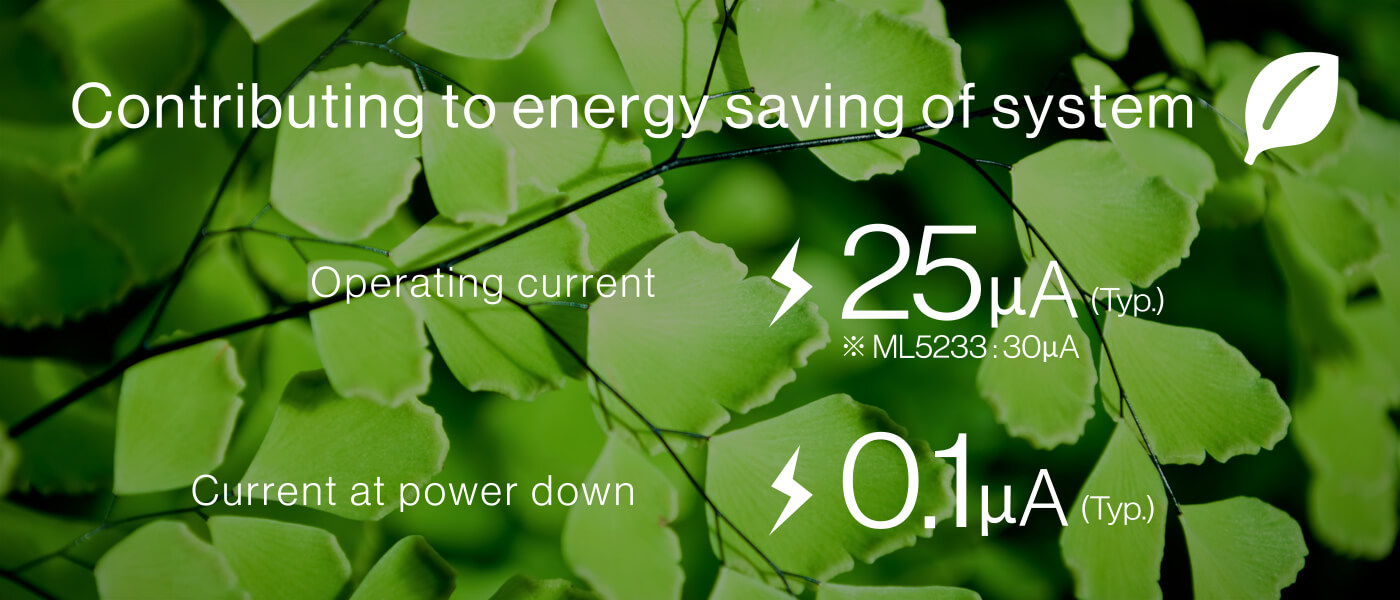 The current consumption in normal operation mode is 25µA (typ.), (ML5233 is 30µA) which is the lowest in the industry, and contributes to energy saving of the system.