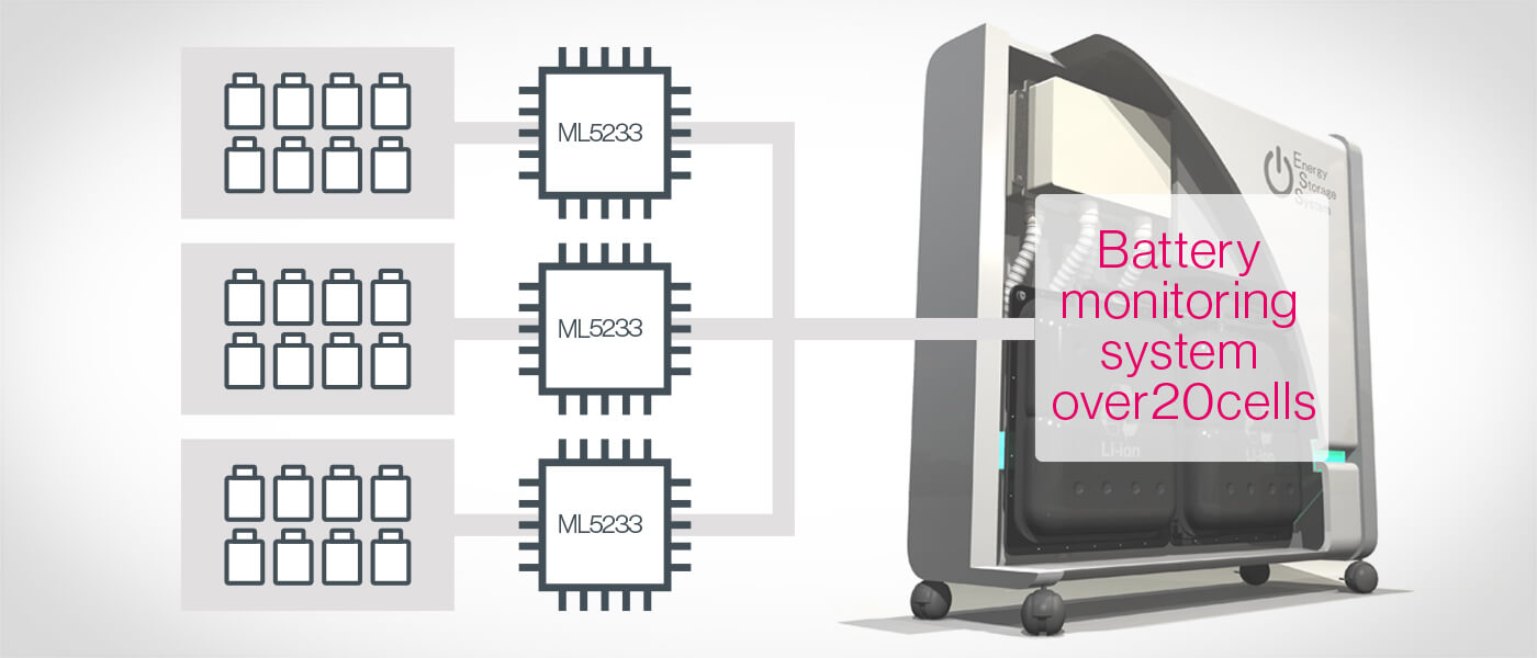 ML5233 supports the multistage connection. It is possible to construct a multi-cell, exceeding 20-cells, high voltage Lithium-Ion battery system.