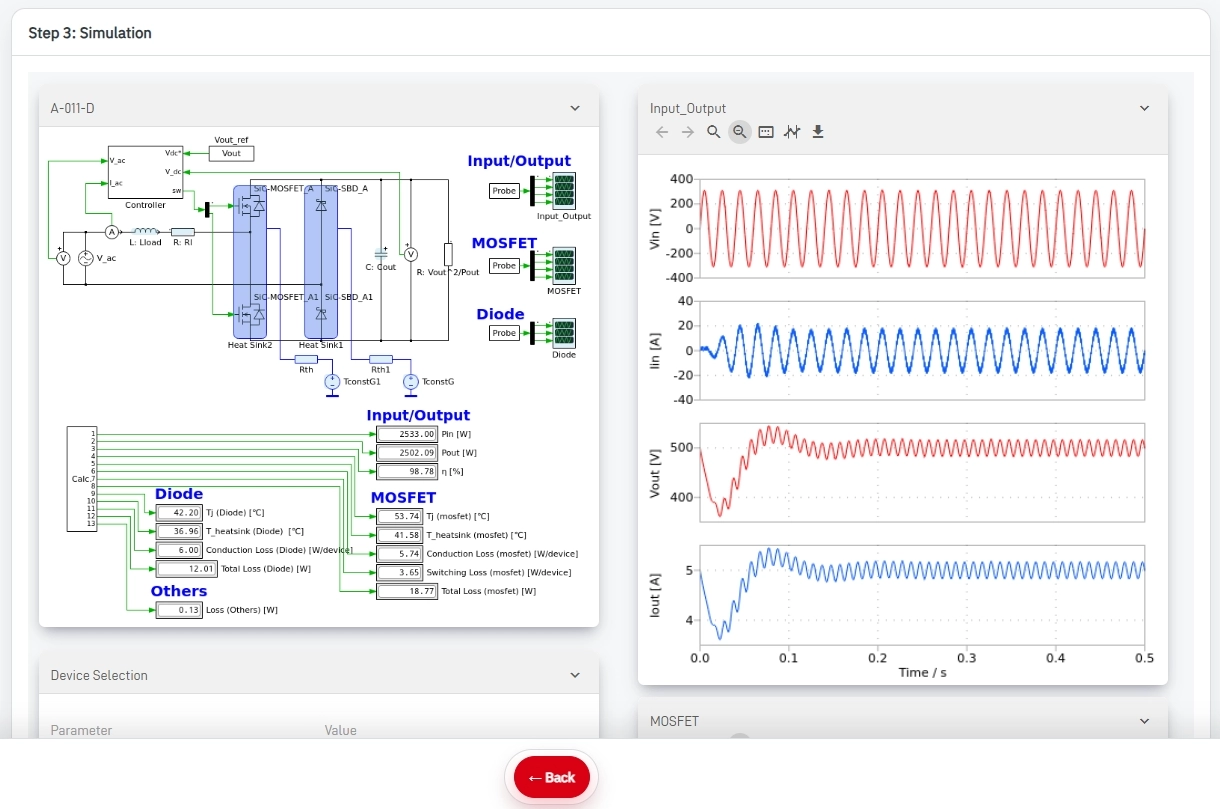 Der ROHM-PLECS Simulator ist ein webbasierter Simulator, der durch intuitive Bedienung eine schnelle und einfache Auswahl von Leistungsbauelementen für die Entwicklung von Leistungselektronik ermöglicht. Wählen Sie eine vorbereitete Schaltungstopologie aus, wählen Sie Bauelemente aus und überprüfen Sie sofort Verluste, Temperatur und Wellenformen. Der Simulator hilft Ihnen dabei, die optimalen Bauelemente für Ihre Anforderungen zu finden und die thermischen Eigenschaften von Kühlkörpern zu überprüfen.