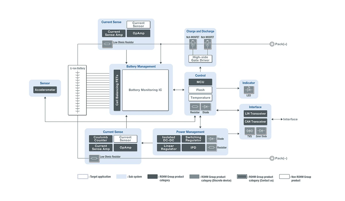 ROHM trägt durch die Bereitstellung von MCUs, Stromversorgungs-ICs, FETs für den Zellenausgleich sowie hochpräzisen Stromerkennungslösungen zur Verbesserung der BMS-Leistung bei.