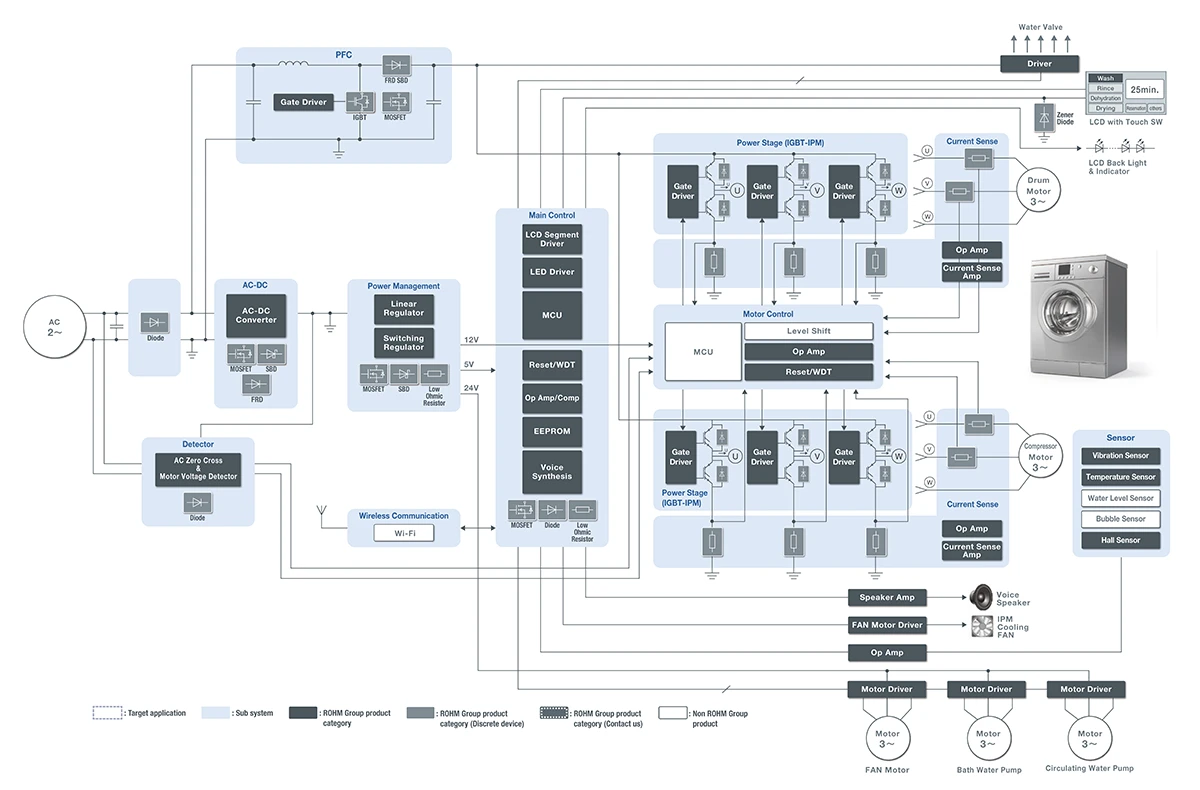 Waschmaschinen bieten dem Verbraucher immer mehr Funktionen und es besteht eine steigende Nachfrage nach Stromversorgungsprodukten und kompakten Bauteilen, die eine höhere Effizienz, geringere Verluste und eine stärkere Miniaturisierung bieten.