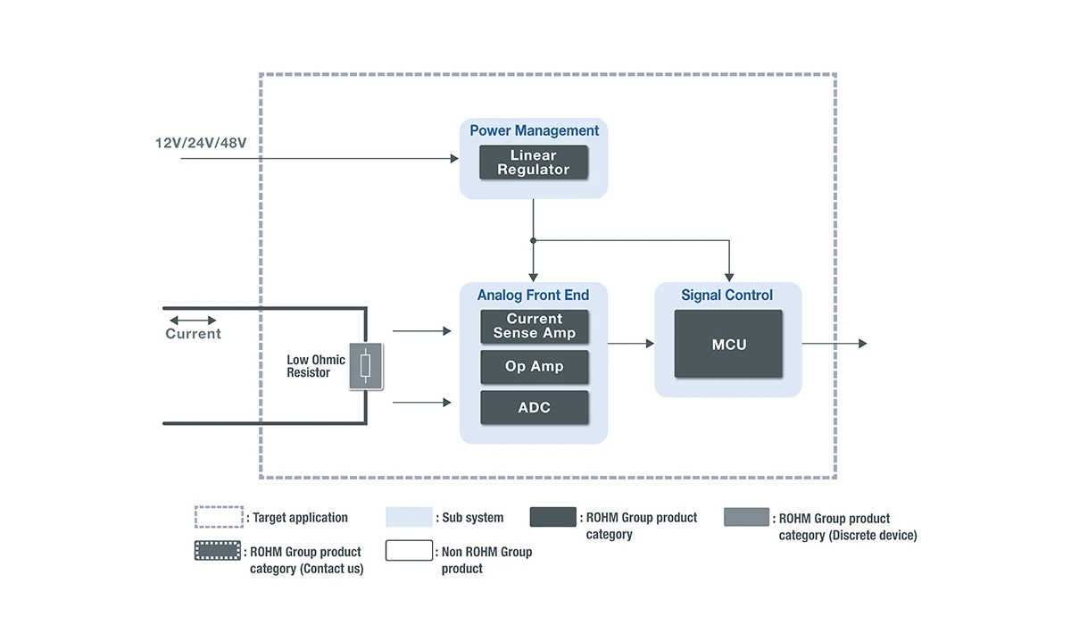 Für Methoden, die den Spannungsabfall über einem Shunt-Widerstand messen, bietet ROHM hochpräzise Strommesslösungen mit Shunt-Widerständen mit hoher Wärmeableitung, hochpräzisen Strommessverstärkern und Präzisions-Operationsverstärkern.