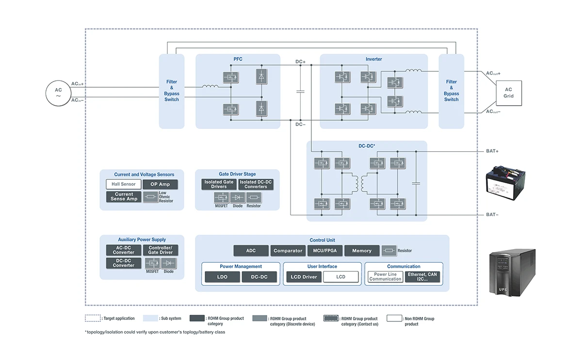 ROHM trägt mit einer breiten Palette an Leistungshalbleitern und Stromversorgungstopologien, die sich für kleine USVs bis hin zu großen USVs mit 100 kVA eignen, zum Aufbau robuster Stromversorgungssysteme bei.