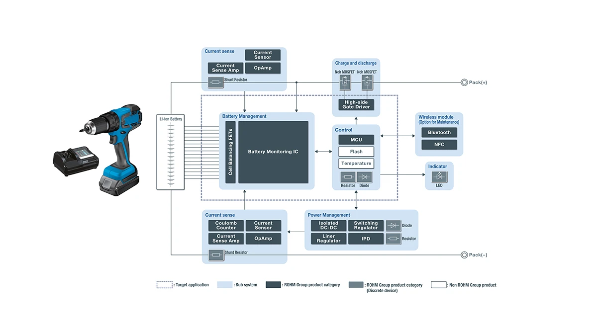 ROHM bietet eine breite Palette an Produkten für Batteriepacks in Industriegeräten, darunter vor allem Batterieüberwachungs-ICs für bis zu 16 Zellen und mehrstufige Reihenkonfigurationen sowie hochpräzise Coulomb-Zähler für hohe Ströme, und trägt so zur Entwicklung hochfunktionaler und hochpräziser Batteriemanagementsysteme bei.