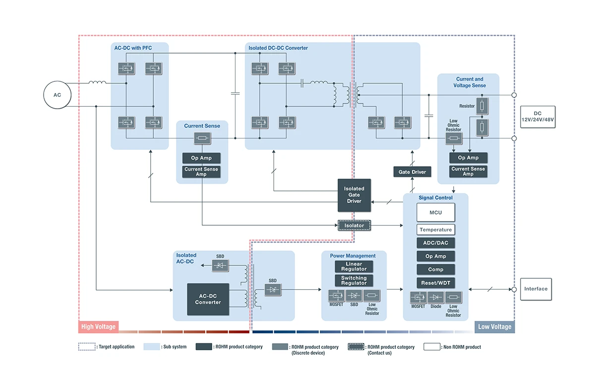 ROHM bietet ein umfangreiches Sortiment an Halbleiterbauelementen, ICs und Modulen, die speziell für industrielle Stromversorgungssysteme in einer Vielzahl von Topologien entwickelt wurden. Unsere Lösungen optimieren die Leistung von primären/sekundären, isolierten/nicht isolierten, diskreten und IC-basierten Designs.