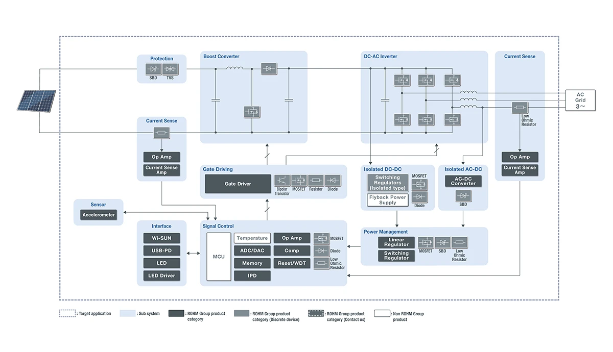ROHM bietet Power-Lösungen mit Schwerpunkt auf Leistungshalbleitern, um die mit Sonnenenergie erzeugte Elektrizität effizient in das Stromnetz einzuspeisen. In einer Konfiguration, in der die instabile Gleichspannung aus Sonnenenergie erhöht und mit einem DC-AC-Wechselrichter in Wechselstrom mit der gewünschten Spannung und Frequenz umgewandelt wird, trägt ROHM mit einer Produktpalette von optimalen Komponenten für die einzelnen Blöcke zur Verbesserung der Eigenschaften des Gesamtsystems bei.
