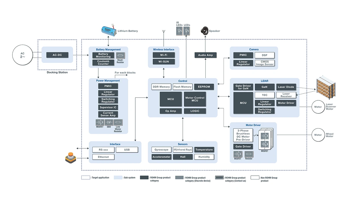 ROHM unterstützt die Verbesserung des autonomen Fahrens und der IoT-Konnektivität in AGVs durch die Bereitstellung von weitreichenden, hochpräzisen LiDAR-Lösungen mit leistungsstarken Laserdioden und GaN-HEMTs sowie drahtloser Kommunikation, Sensoren und Motorantriebsprodukten.