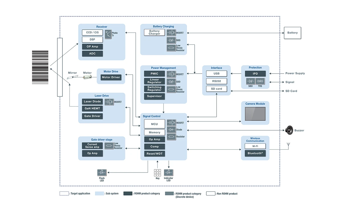 ROHM unterstützt diesen Trend mit umfassenden Lösungen für Codeleser, die photonische Produkte für das Scannen, Leistungshalbleiter für die Antriebssteuerung sowie Shunt-Widerstände und Operationsverstärker für die präzise Strommessung umfassen und so zur Reduzierung des Designaufwands und der Entwicklungszeit beitragen.