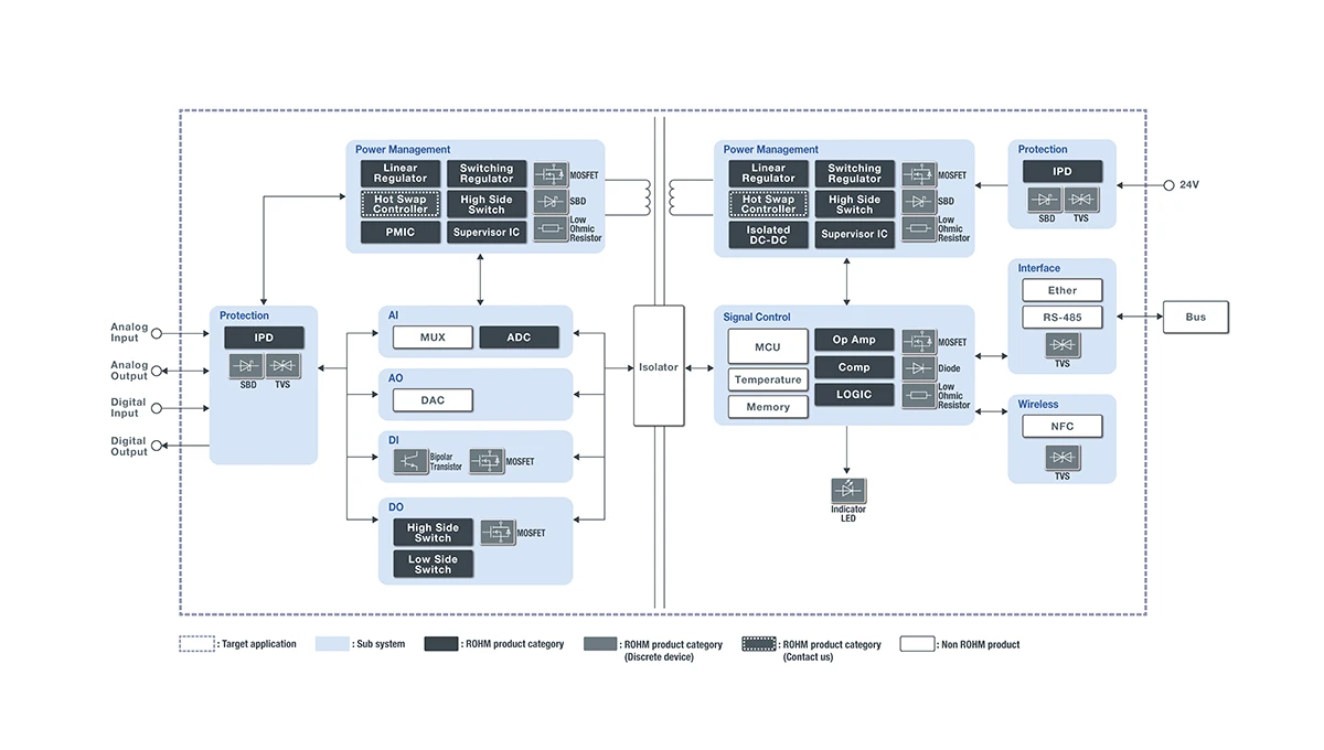 ROHM erfüllt diese Anforderungen mit hocheffizienten Stromversorgungs-ICs, die für Ein-/Ausgabeeinheiten optimiert sind, IPDs mit integrierten Schutzschaltungen und einer Vielzahl von Signalverarbeitungs-ICs, die die Gesamtzuverlässigkeit und Störfestigkeit verbessern.