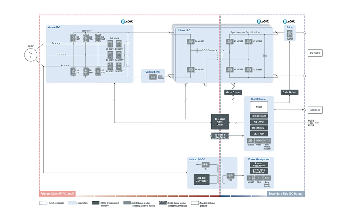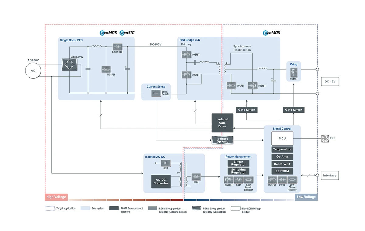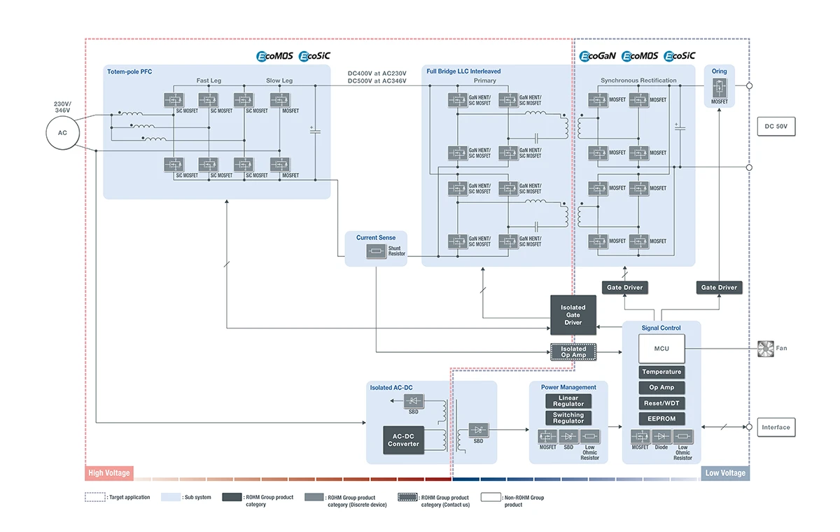 ROHM bietet eine Komplettlösung für alle Leistungsanforderungen, die an Server-Stromversorgungen der nächsten Generation gestellt werden. Für Primärkreise, die mit immer höheren Spannungen und Strömen arbeiten, bieten wir branchenführende SiC-Bauteile und Hochgeschwindigkeits-GaN-Bauteile, die eine überwältigende Effizienzsteigerung erzielen. Darüber hinaus bieten wir für sekundärseitige Gleichrichtungsanwendungen an 50‑V‑Ausgängen – mittlerweile Standard in KI-Servern – leistungsstarke LVMOS-Bauteile mit einer Nennspannung von 80 V und mehr, die die Leitungsverluste auf ein absolutes Minimum reduzieren. Selbstverständlich verfügen wir auch über ein umfangreiches Sortiment an Super-Junction-MOSFETs (SJ-MOSFETs), die ein ausgezeichnetes Preis-Leistungs-Verhältnis bieten und sich ideal für den Low-Speed-Switch in Totem-Pole-PFC eignen.