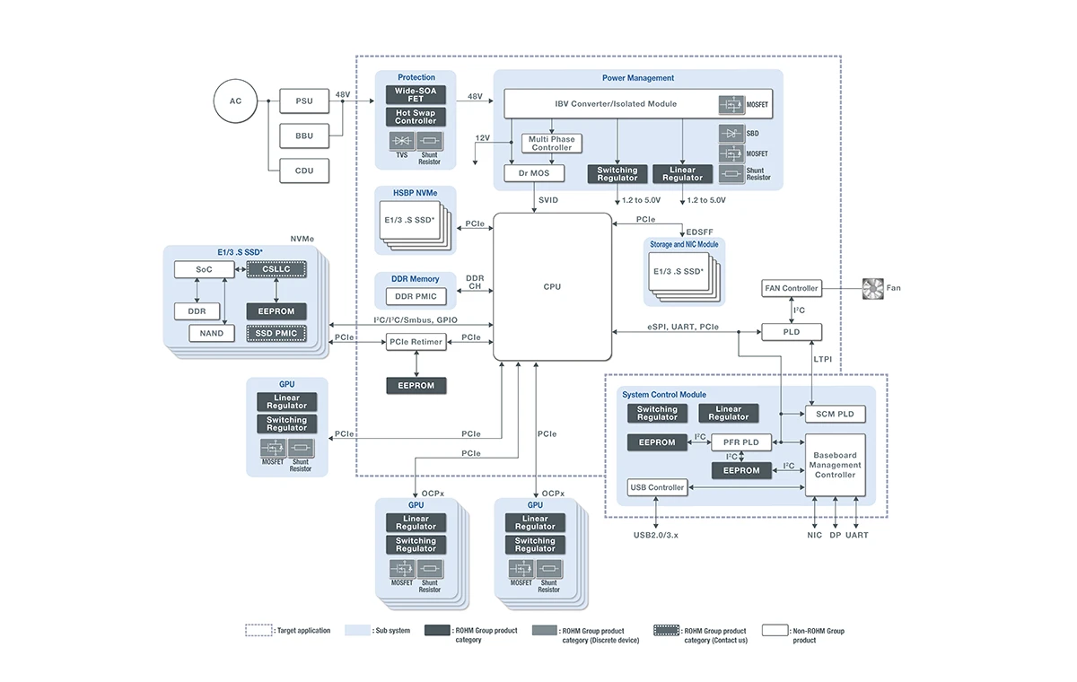 ROHM bietet Komplettlösungen, die hocheffiziente Leistungs-ICs mit leistungsstarken MOSFETs - darunter auch GaN-Bauelemente (Galliumnitrid) - kombinieren. Diese Antriebstechnologien maximieren die Eigenschaften der Bauelemente und reduzieren so die Verluste bei der Energieumwandlung drastisch. Dadurch werden gleichzeitig eine geringe Wärmeentwicklung und eine hohe Leistungsdichte erreicht, was sowohl zu einer verbesserten Verarbeitungsleistung als auch zu Energieeinsparungen bei Serverplatinen beiträgt.